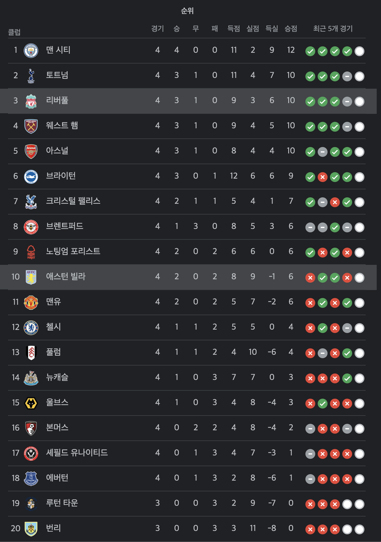 빌라를 가볍게 제압한 리버풀은 승점 10(31) 되면서 리그 3위로 올라섰습니다. 토트넘 홋스퍼, 웨스트햄 유나이티드, 아스널과 승점이 같지만 득실차에서 앞서 리버풀(+6) 2 토트넘(+7) 바로 다음인 3위에 위치했습니다. 반면에 빌라는 승점 6(22)으로 리그 10위를 마크했습니다.