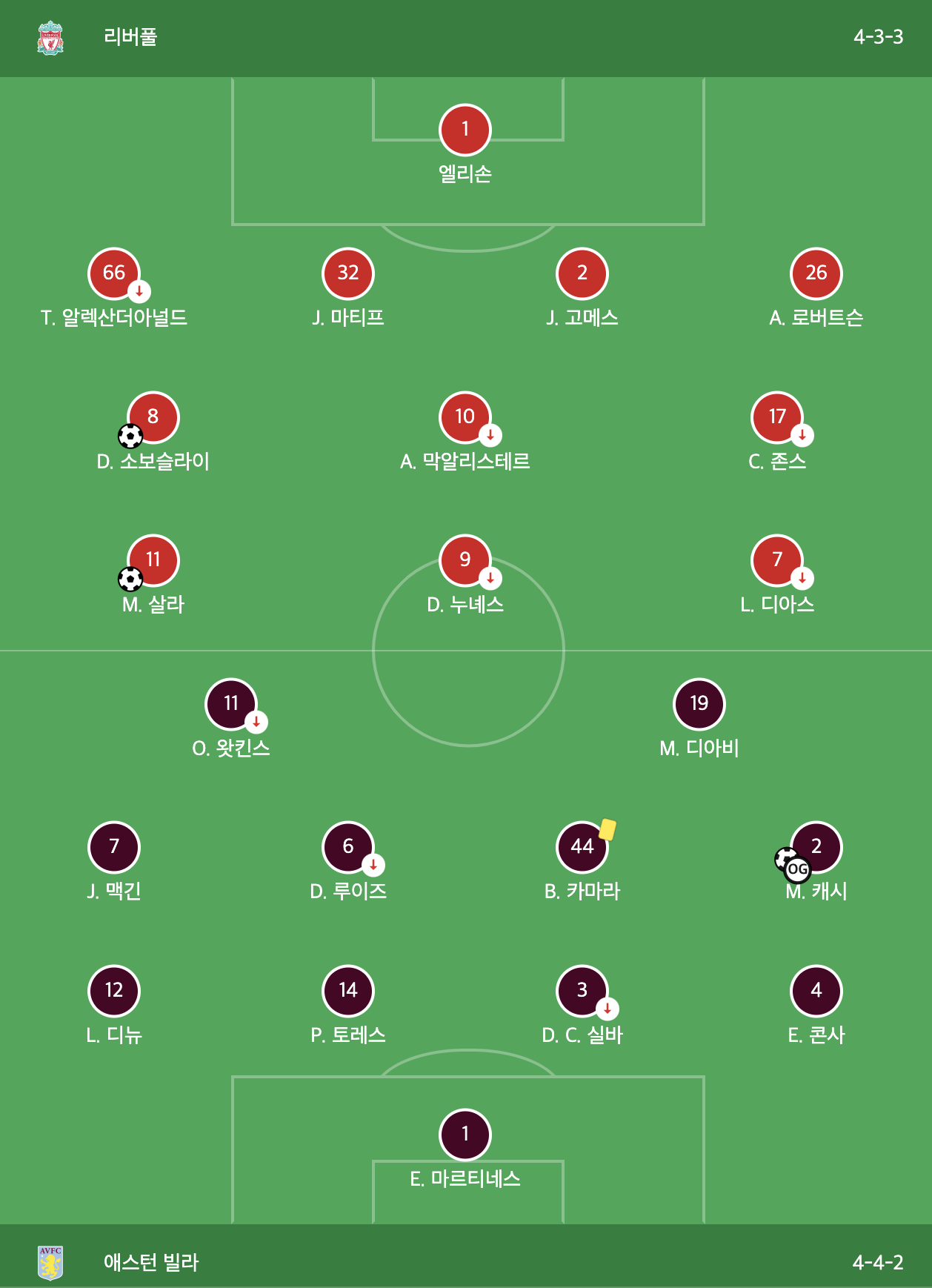전반 3분 소보슬러이의 선제골로 앞서가기 시작한 리버풀은 전반 22분 빌라의 자책골로 점수 차를 벌렸습니다. 우루과이 공격수 다르윈 누네스의 슈팅이 골대를 맞고 나왔는데, 튕겨져 나온 공을 수비수 매티 캐시가 피하지 못하면서 그대로 캐시의 자책골로 이어졌습니다.