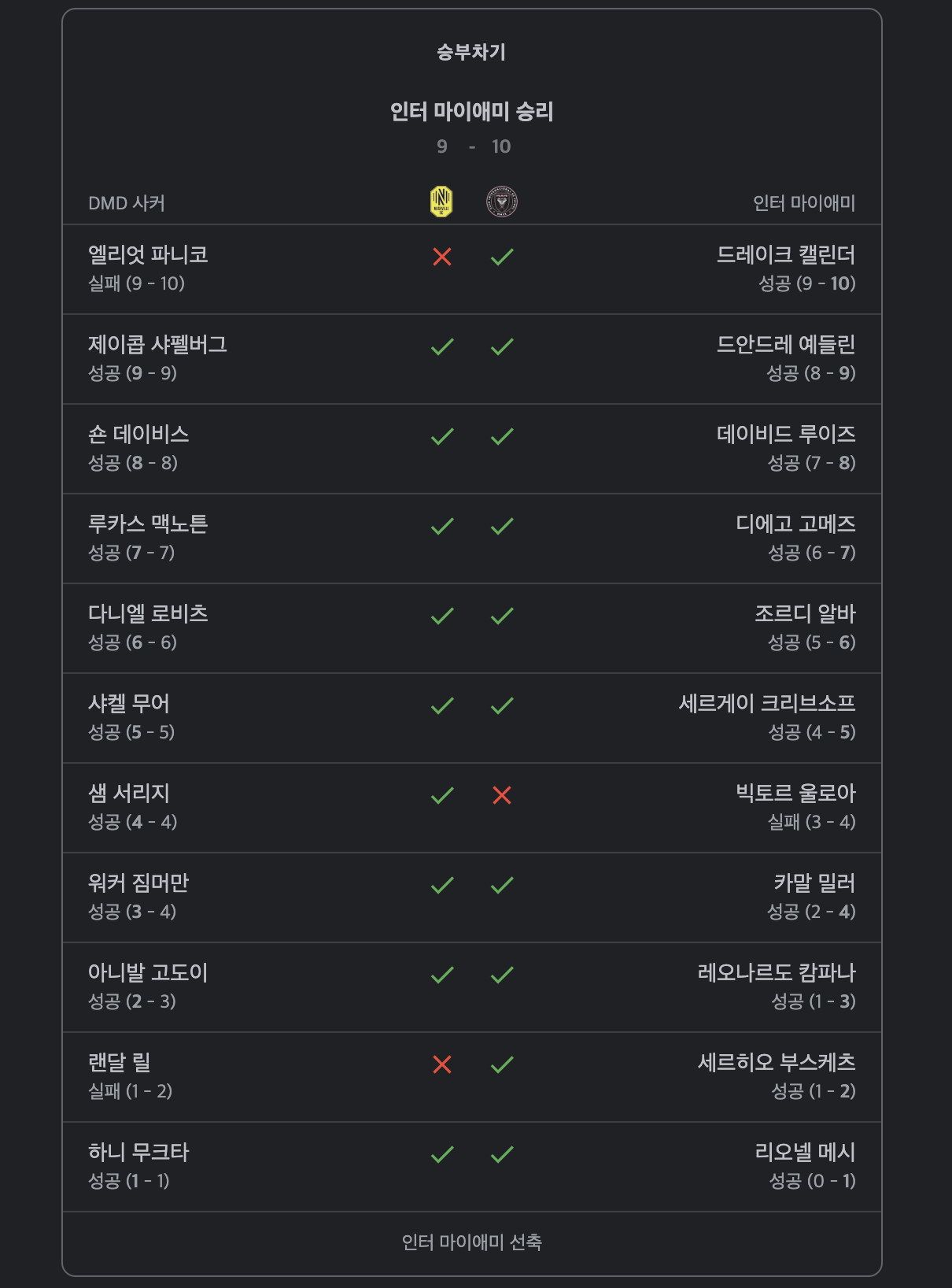 마이애미의 골키퍼 드레이크 캘린더가 먼저 정확하게 킥을 성공하였고, 내슈빌의 골키퍼 엘리엇 파니코가 찬 공을 멋지게 막아내며 자신의 손과 발로 우승을 확정했습니다.