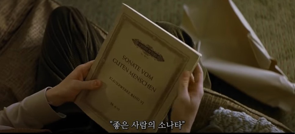 어느날 '드라이만' 에게 한 통의 전화가 걸려오고 그의 동료 '예르스카'의 비보를 전합니다. 그가 스스로 명을 달리했음을 알게된 '드라이만'은 그가 마지막으로 남긴 악보'좋은 사람의 소나타'를 꺼내어 연주하며 추모하고 그 아름다운 선율과 상반된 현실에 이 모든 것을 전부 듣고 있던 '비즐러'는 자신도 모르게 눈물을 흘리고 어느 순간 '드라이만'의 마음을 공유하고 있었습니다.