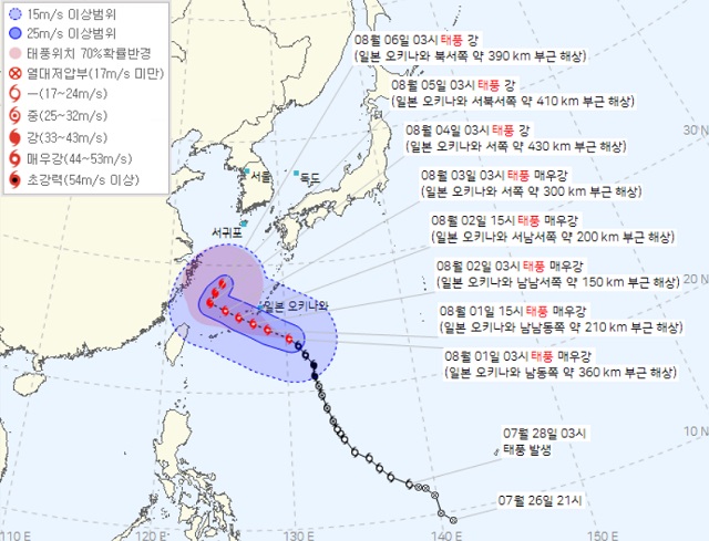 다만 제주도 주변 해수면 온도가 27도 정도인 것을 비롯해 북위 25도 이상 바다의 해수면 온도가 평년보다 1도 이상 높아 북위 30도까지는 바다가 태풍이 발달하기 매우 좋은 상태인 것으로 분석되고 있습니다.