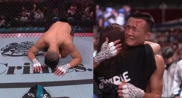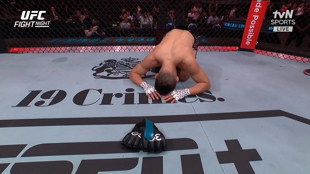 정찬성은 그 동안 UFC에서 2차례 타이틀 도전, 10 연속 메인 이벤트 등의 활약을 펼쳤습니다. 경기 후 아내와 함께 옥타곤에서 글러브를 내려놓고 바닥에 큰절한 정찬성은 그의 16년간의 프로 파이터 생활을 돌아보며 흐느꼈습니다.