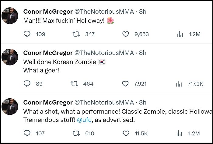 전 UFC 페더급-라이트급 챔피언 코너 맥그리거(35·아일랜드), UFC 헤비급 챔피언 존 존스(36·미국), 전 UFC 플라이급-밴텀급 챔피언 헨리 세후도(36·미국), 그리고 전 UFC 플라이급 챔피언 드미트리우스 존슨(37·미국) 등 동료 선수들 역시 정찬성의 은퇴를 아쉬워함과 동시에 그를 레전드라 이야기 하며 존경의 메시지를 전달했습니다.